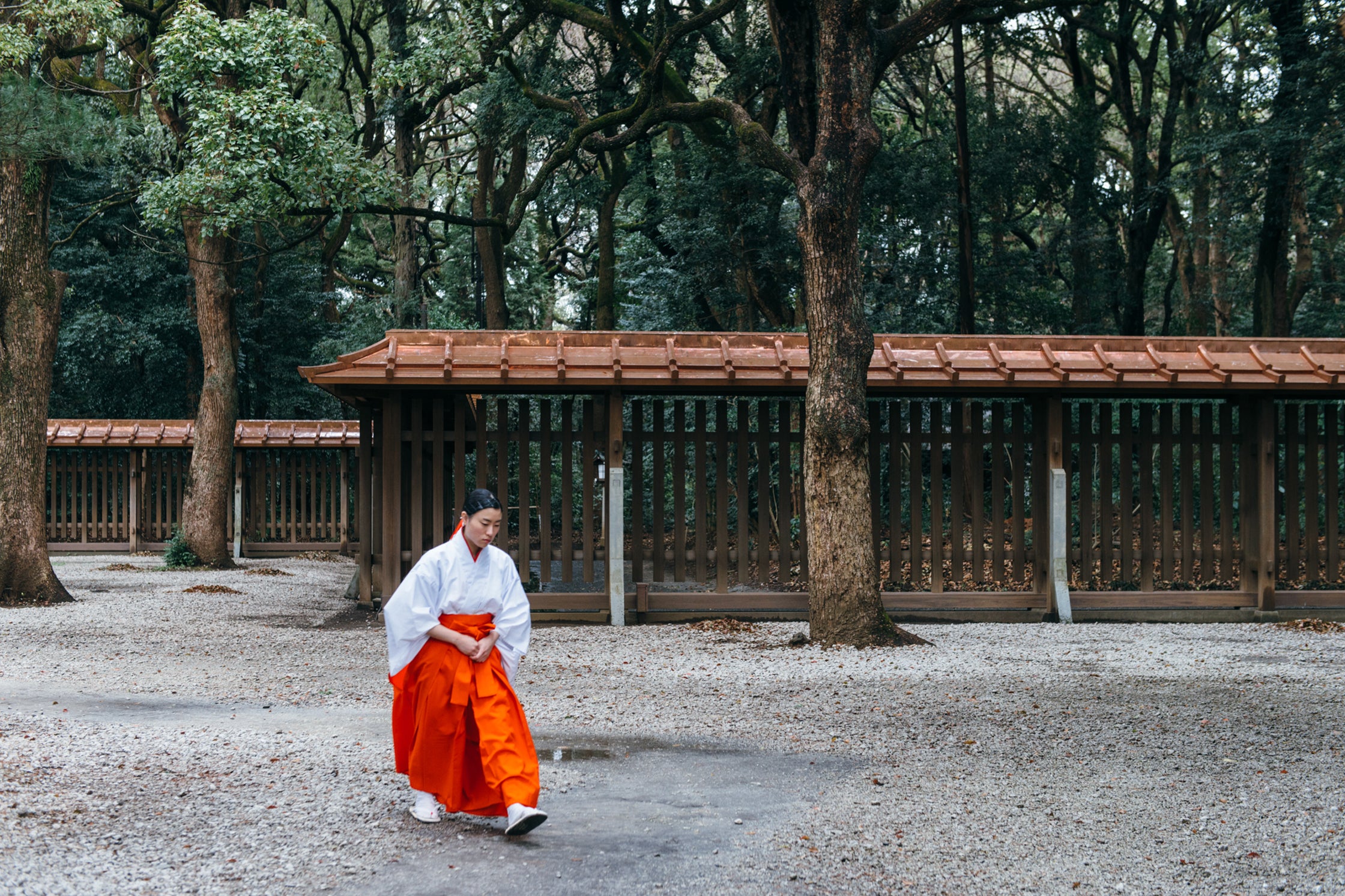 Meiji Shrine (明治神宮, Meiji Jingū) is a shrine dedicated to the deified spirits of Emperor Meiji and his consort, Empress Shoken. The shrine was destroyed during the Second World War but was rebuilt shortly thereafter. The Shrine and the adjacent Yoyogi Park make up a large forested area within the densely built-up city, also home of one of the biggest Sakura celebrations in Tokyo.