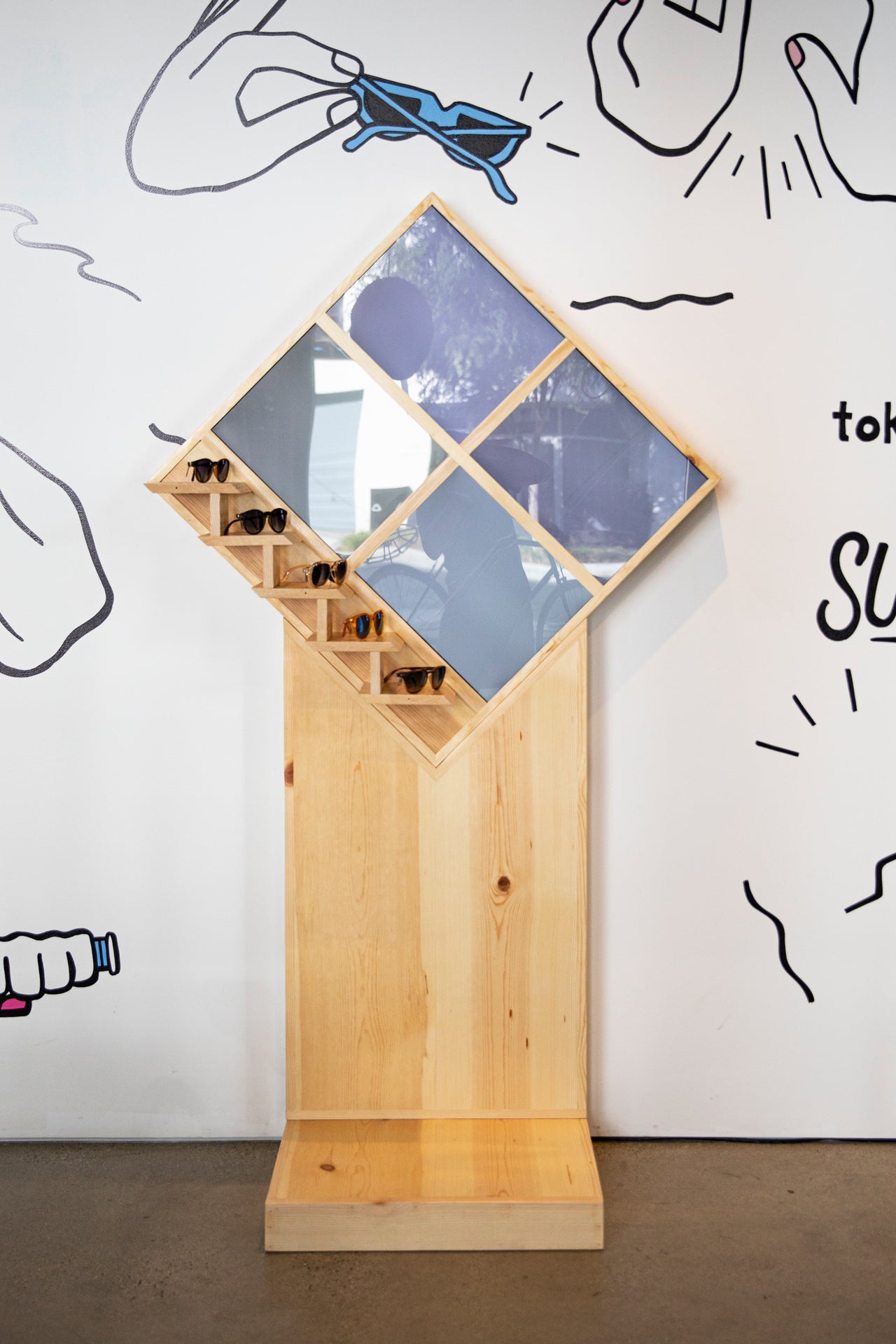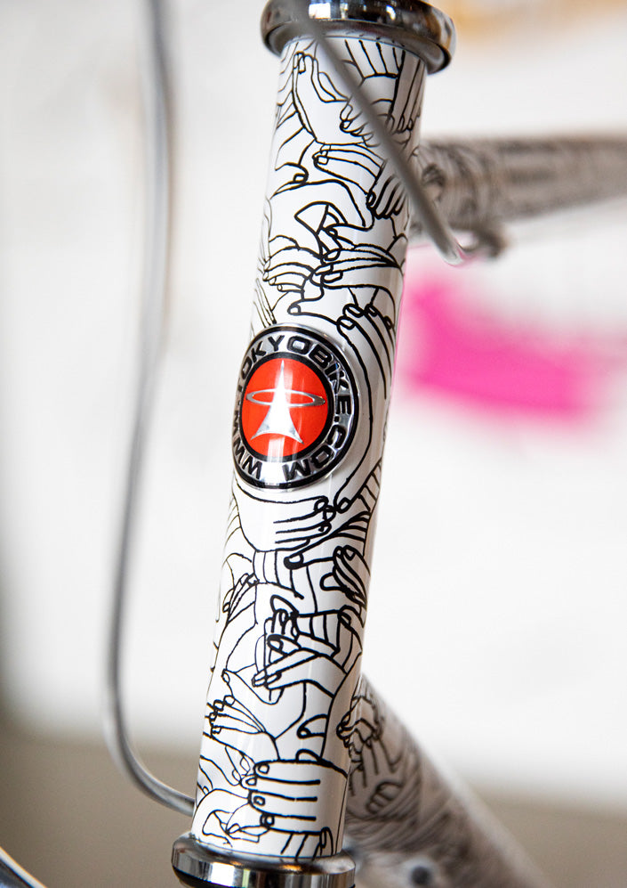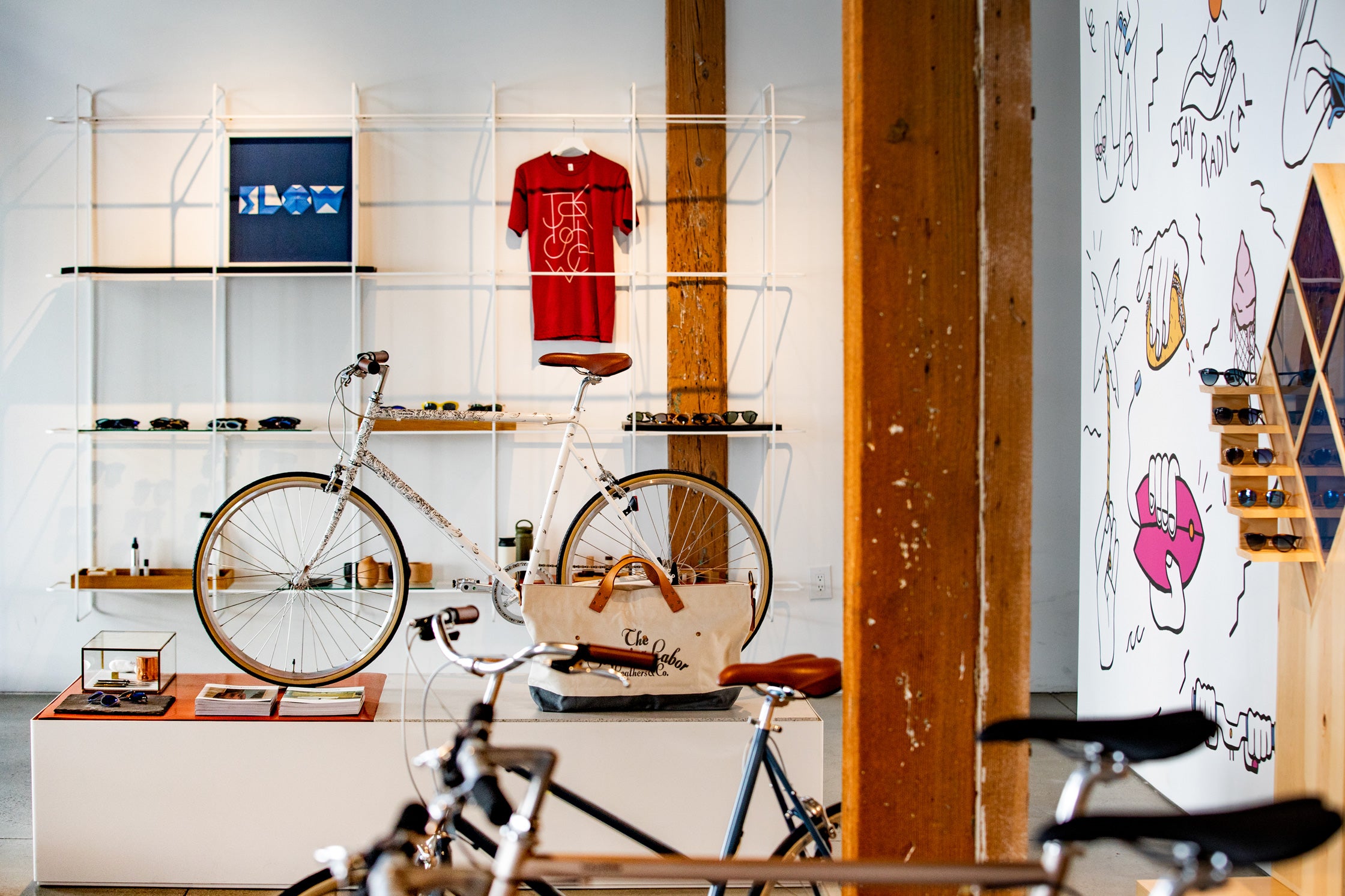 Surrounding the secret video display, you'll find a mural by local Los Angeles illustrator, painter, and muralist Priscilla C. Witte. Witte lives by her bicycle in Los Angeles and brought her creative hand to custom paint a mural with what can be grabbed in Los Angeles while on two wheels. Earlier this year, she collaborated with Sunski on a custom cleaning cloth that is available in the tokyobike store with purchase, while supplies last.